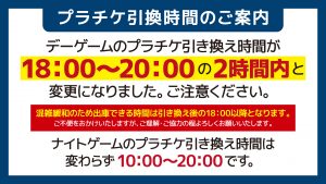 デーゲーム開催日のプラチケ引換時間は、18:00〜20:00(2時間) に変更となりました。また、混雑緩和のため出庫は引換後の 18:00以降 にお願いしております。なお、ナイトゲーム開催日の引換時間は従来通り 10:00〜20:00 です。ご不便をおかけいたしますが、安全で円滑な運営のため、 何卒ご理解・ご協力のほどお願い申し上げます。