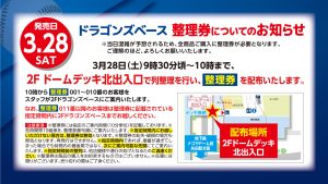 なお、整理券11番以降のお客様は整理券に記載されている指定時間内に2Fドラゴンズベースまでお越しください。